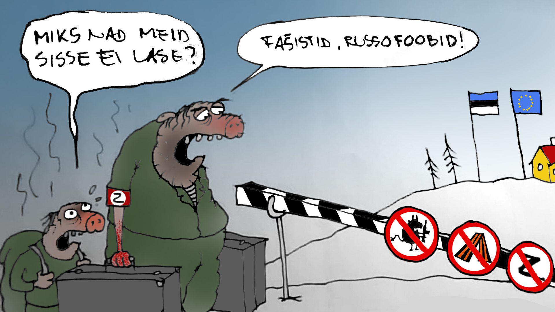 In this 2023 poster by the Estonian newspaper Postimees, the smaller pig says ‘ why are we not allowed in ‘ and the bigger pig says ‘ fascist, russophobe ‘.
