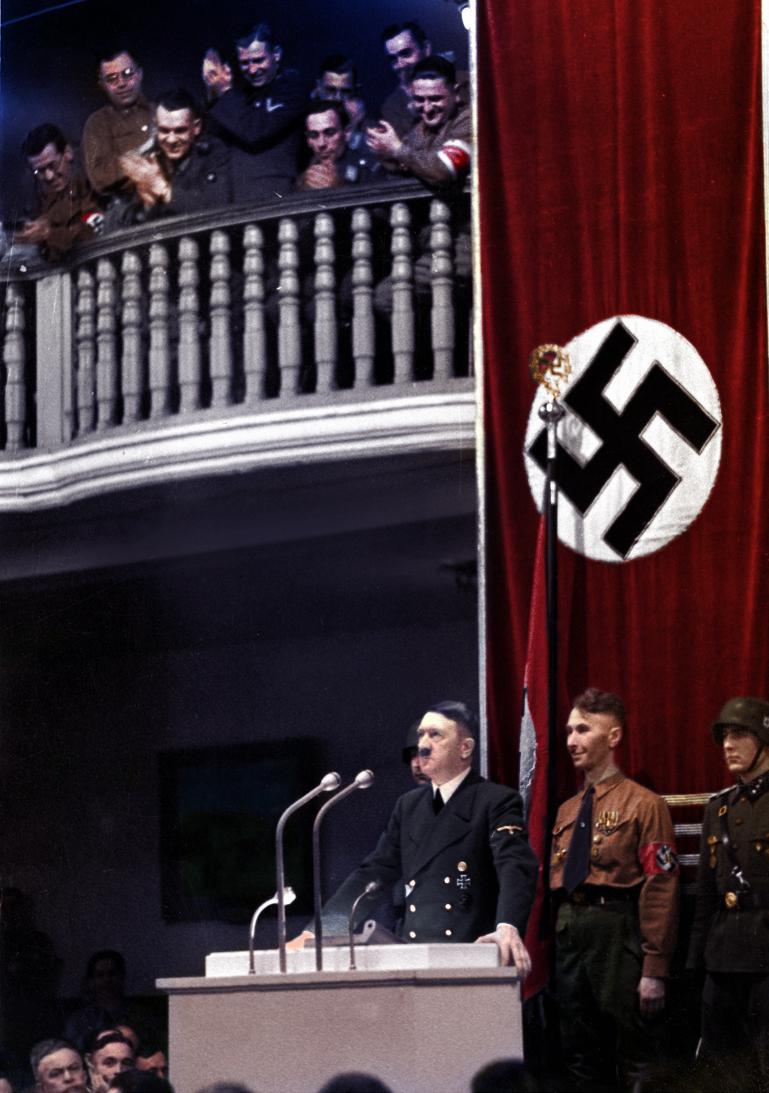 Hitler speaking at the Munich Bürgerbräukeller on the 16th Anniversary of the Putsch, November 8, 1939. There is a bomb placed by George Elser in the pillar behind Hitler. It is concealed by the Flag.