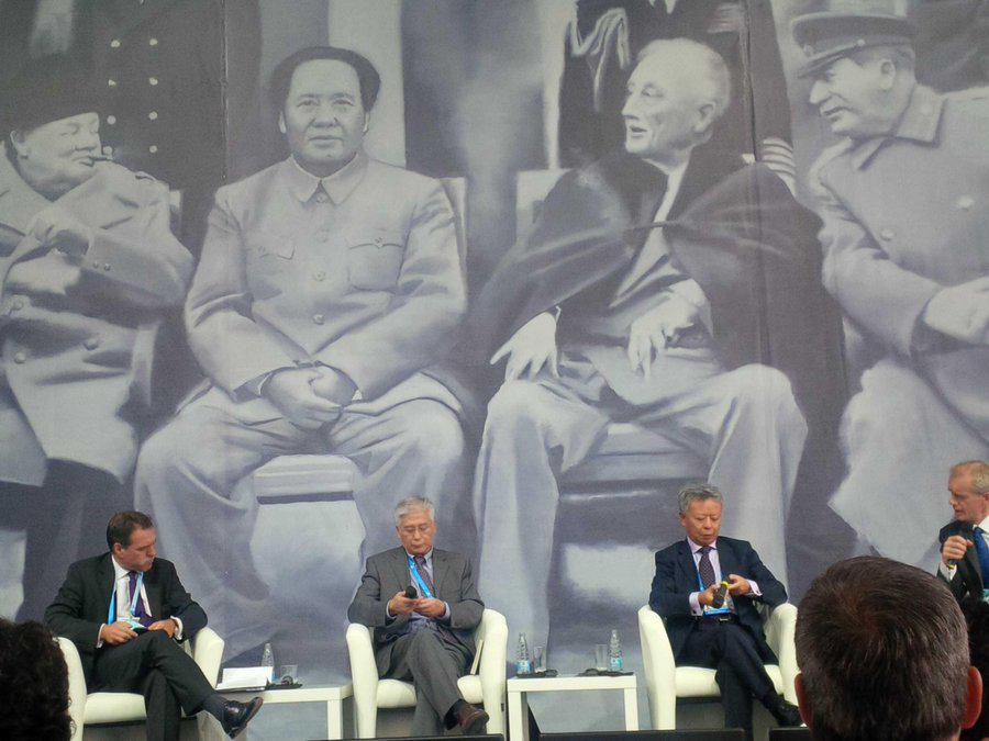 Mural displayed by Chinese officials during a diplomatic conference at Yalta, 2013. The image, designed by Chinese artist Shi Xinning, shows a version of the famous ‘big 3’ conference at Yalta with Mao inserted into it