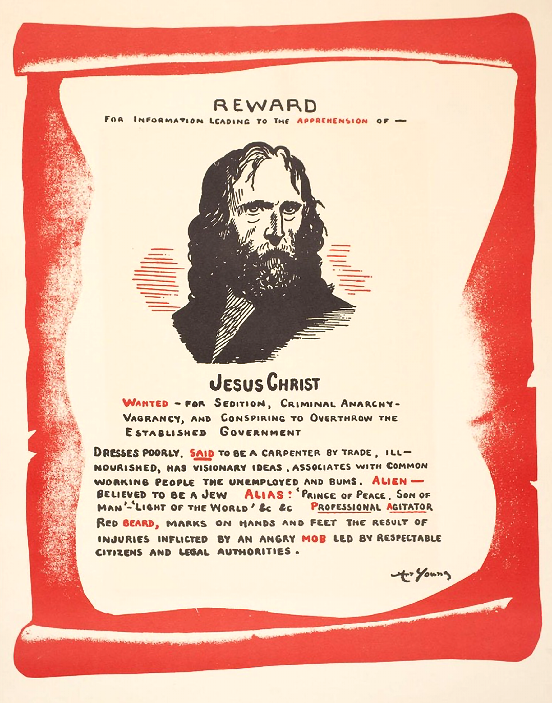 “…Jesus Christ, WANTED — For Sedition, Criminal Anarchy, Vagrancy, and Conspiring to Overthrow the Established Government…” Socialist cartoon published in ‘The Masses’, shortly before it was shut down by the U.S. government for printing “treasonable material” and obstructing conscription. 1917, USA. Gallery “…Jesus Christ, WANTED — For Sedition, Criminal Anarchy, Vagrancy, and Conspiring to Overthrow the Established Government…” Socialist cartoon published in ‘The Masses’, shortly before it was shut down by the U.S. government for printing “treasonable material” and obstructing conscription. 1917, USA. Uncategorized “…Jesus Christ, WANTED — For Sedition, Criminal Anarchy, Vagrancy, and Conspiring to Overthrow the Established Government…” Socialist cartoon published in ‘The Masses’, shortly before it was shut down by the U.S. government for printing “treasonable material” and obstructing conscription. 1917, USA. By action-reaction|2025-12-11T17:52:33-05:00December 11, 2025|Uncategorized|0 Comments Read More